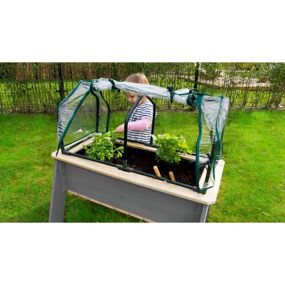 Das EXIT Aksent Hochbeet L steht auf Beinen, sodass du stehend und mit mehreren Kindern zugleich gärtnern kannst. Tiere können hierdurch auch weniger schnell an die Hochbeete gelangen und du kannst nach dem Spielen einfach um das Hochbeet herum fegen. Das mitgelieferte Wurzeltuch sorgt dafür, dass überschüssiges Wasser entweichen kann und die Pflanzen optimal wachsen können. Das Gewächshaus sorgt dafür dass du bei Wind und Wetter Pflänzchen ziehen kannst. Auch gegen Wind, leichten Frost und Ungeziefer werden die Pflänzchen optimal geschützt.