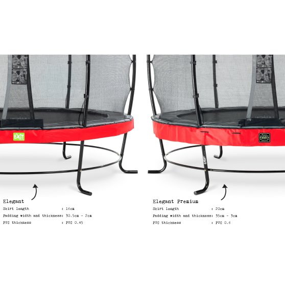 EXIT Elegant Premium Trampoline sind nicht nur schön und von hoher Qualität, sondern auch noch langlebig. Der Rahmen ist galvanisiert und anschließend pulverbeschichtet, sodass Rost keine Chance hat. Die extra langen doppelkonischen Premium-Federn, die 21,6 cm lang sind, sorgen für die ultimative Sprungerfahrung mit einem perfekten Rückprall und weicher Landung. Auch die Schürze des Schutzrandes ist länger als gewöhnlich und die Füllung des Schutzrandes ist dicker im Vergleich mit den Standard EXIT Trampolinen. Die extra dicke PVC oberste Schicht auf dem Schutzrand sorgt schließlich dafür, dass dieser länger hält, also super langlebig!