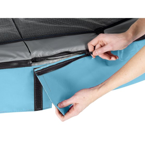 Ein Trampolin im Garten aufbauen ist kompliziert? Nicht mit den EXIT Elegant Trampolinen! Der Rahmen ist einfach zu montieren. Die blaue Schürze kann mit einem Reißverschluss schnell an dem Schutzrand befestigt werden. Der Schutzrand ist stark und mit einem speziell von EXIT Toys entwickelten Foot Protection System (FPS) ausgestattet, sodass du nie während des Trampolinspringens mit deinem Fuß zwischen die Federn kommen kannst. Mit den EXIT Elegant Trampolinen kannst du im Handumdrehen von stundenlangem Springspaß genießen. Innerhalb No-Time ist das Trampolin gebrauchsfertig, also worauf wartest du?