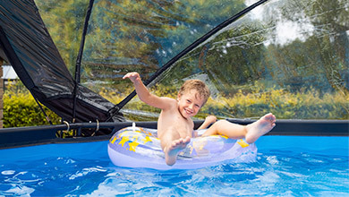 Wir raten dazu, die Abdeckung halb zu öffnen, wenn du den Pool nutzen möchtest. Achte darauf, dass beim Schwimmen unter der EXIT Poolabdeckung immer ausreichend Frischluft vorhanden ist.